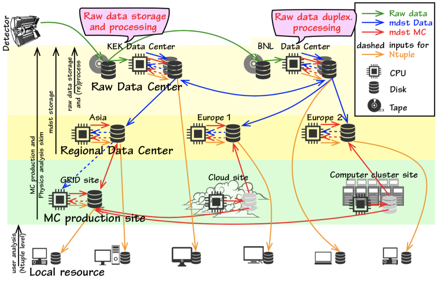Fig. 3.31 The Belle II distributed computing model. Two copies of the raw data are stored and reprocessed at the raw data centers, in order to produce mdst files.#