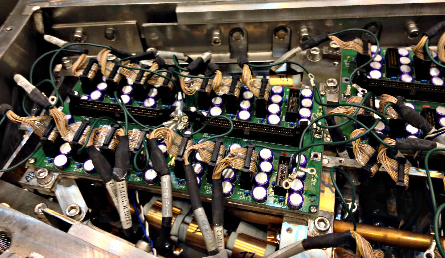 Fig. 3.9 Small part of the ECL electronics in the endcap. Boards do the mapping from the preamps (which you can’t see) to the cables that go to the ShaperDSPs. You can also see the cooling lines under the boards.#