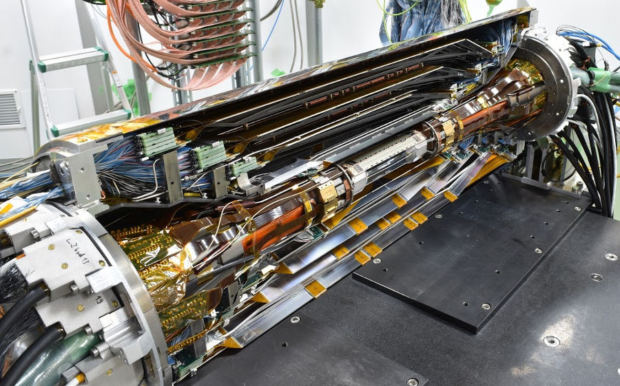 The beam pipe itself is not an active part of the detector, but plays the crucial role of separating the detector from the interaction region, which is located in the low-pressure vacuum of the SuperKEKB rings. It is a cylindrical pipe designed to be as thin as possible in order to minimize the particle’s energy loss in it, but it is also crucial to absorb most of the soft synchrotron X-rays emitted by the beams before they can hit the detector. Otherwise they would represent a major source of noise for the innermost detector, the PXD.